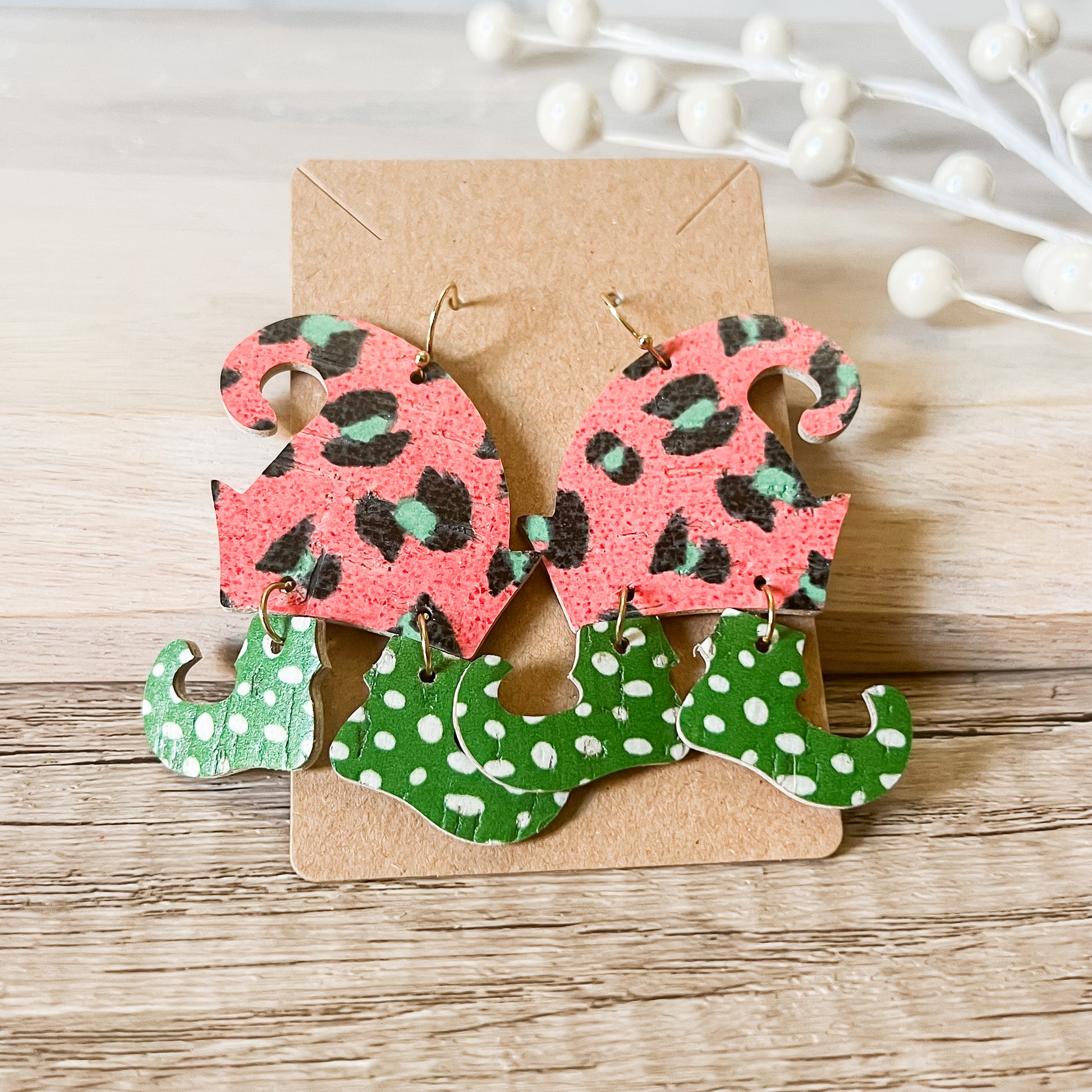 Handmade Genuine Leather Christmas Elf Earrings feature fun red animal print hat and black & green polka boots.