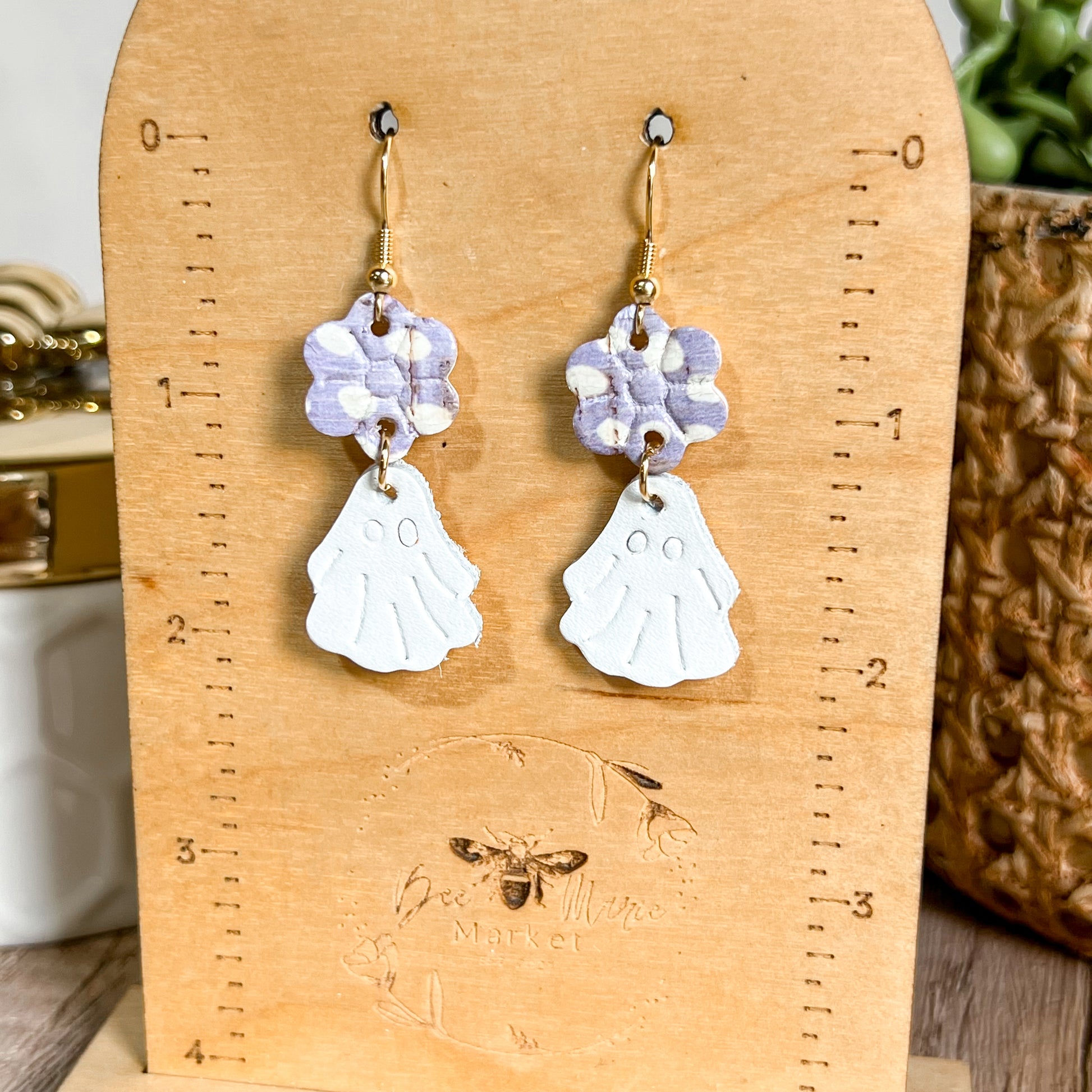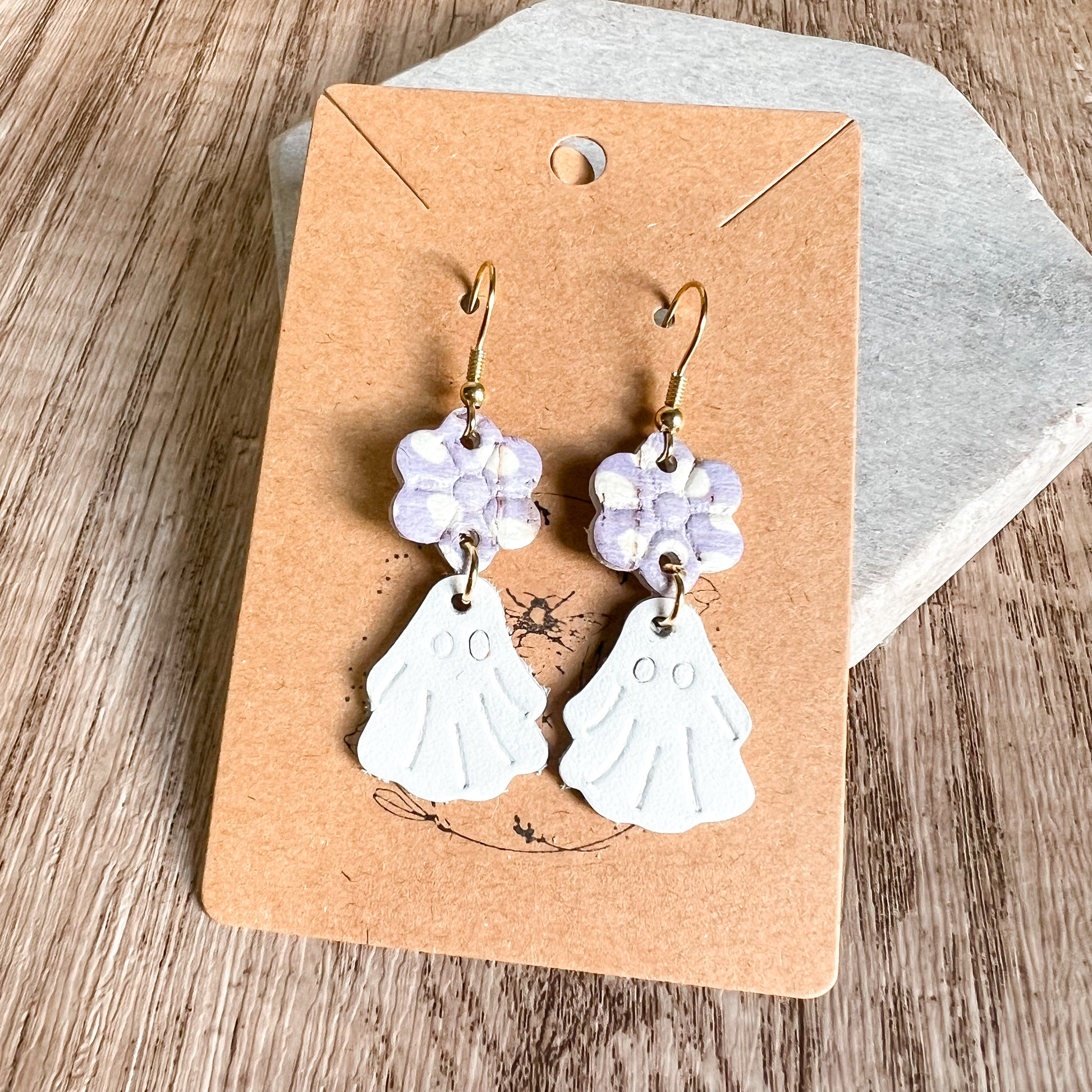 Handcrafted from genuine leather, these playful earrings feature a soft lavender floral stud paired with a dangling white ghost for the perfect mix of cute and festive.