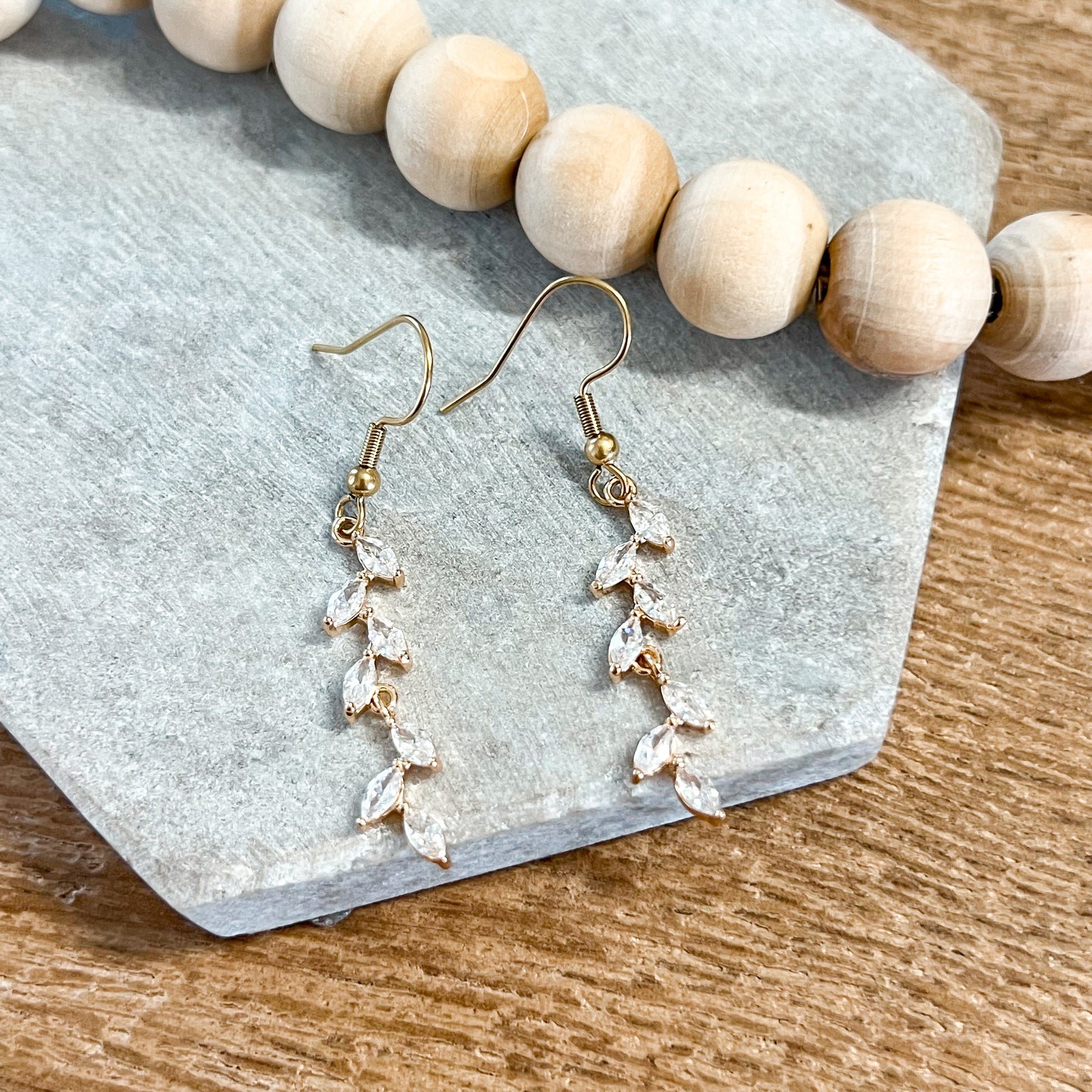Delicate gold vine drops wrapped with shimmering marquise crystals — lightweight, dainty, and full of sparkle.