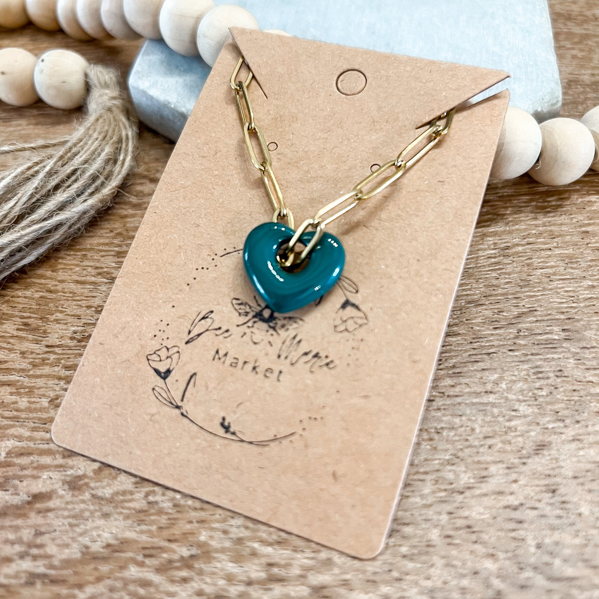 A glossy heart charm on a sleek gold paperclip chain. Simple, sweet, and effortlessly pretty.