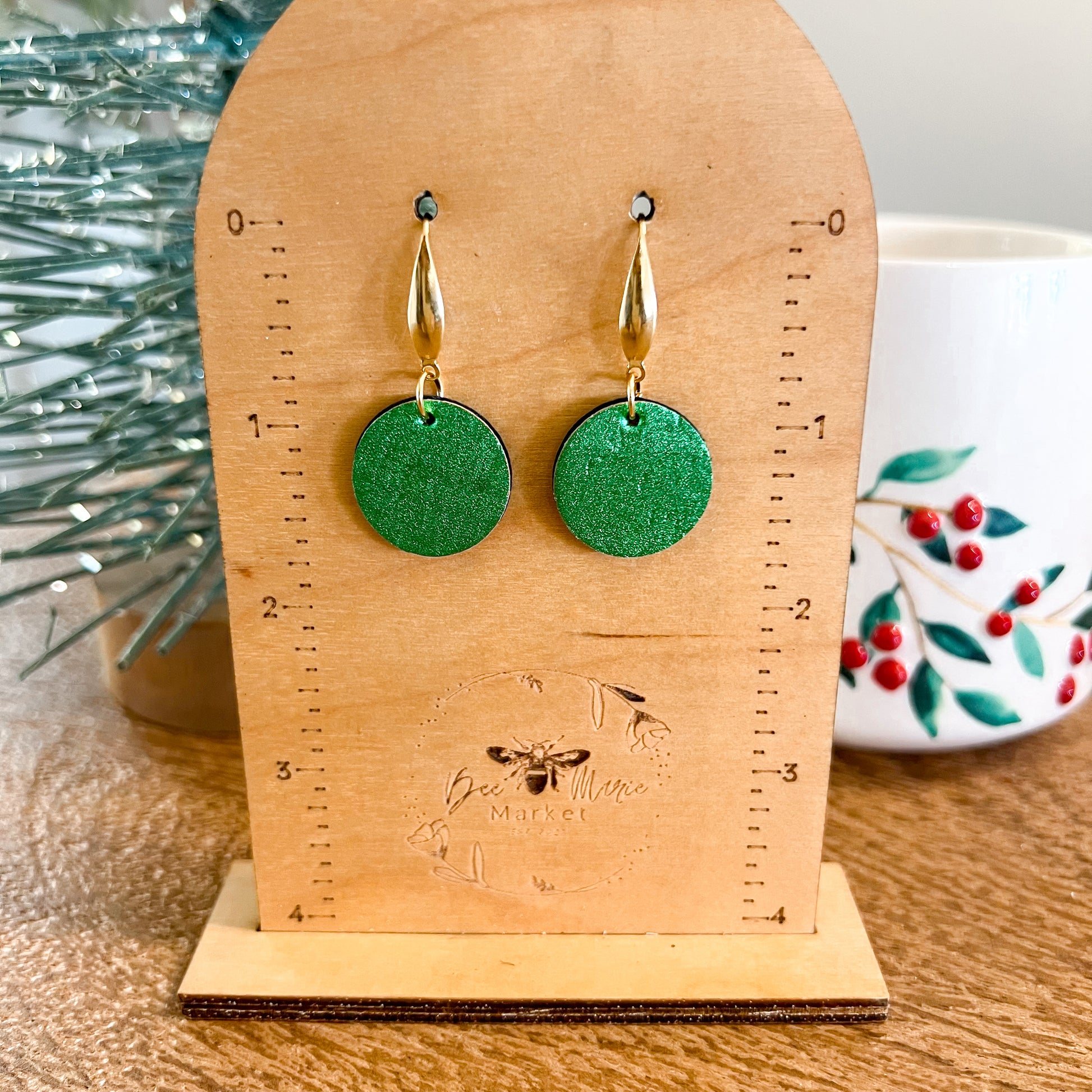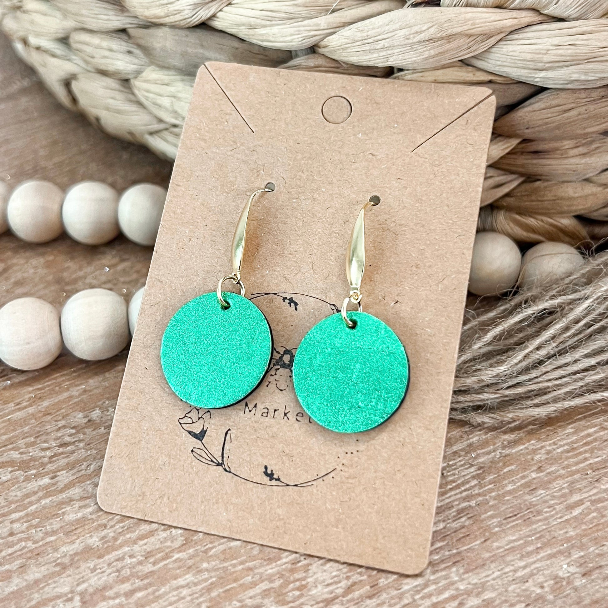 Handcrafted lightweight genuine leather earrings with a stunning emerald shimmer finish. Stainless steel hypoallergenic hooks keep them comfy for everyday wear.