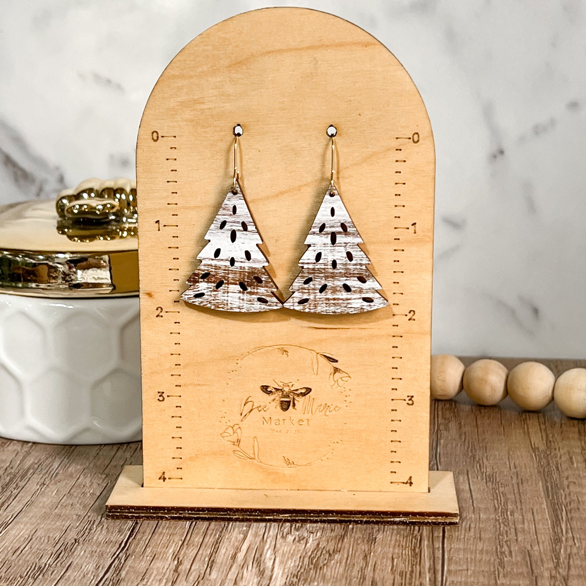 Handmade wooden tree earrings with a charming silhouette and cozy holiday feel.