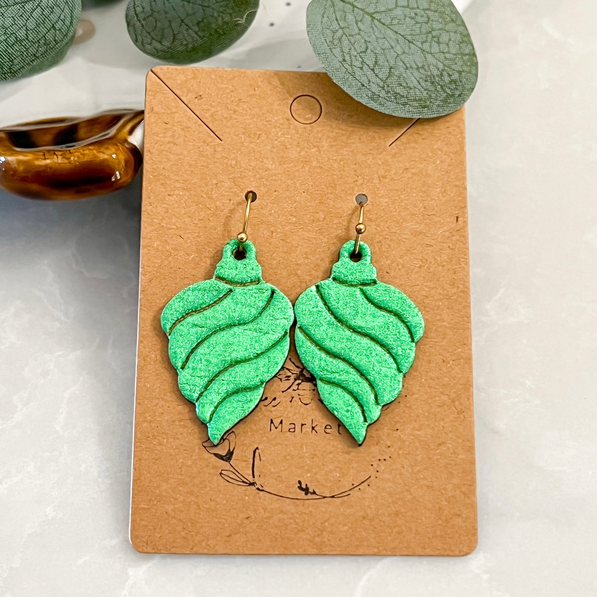 Handmade genuine leather earrings with a fun, festive swirl design and gold stainless steel hooks.