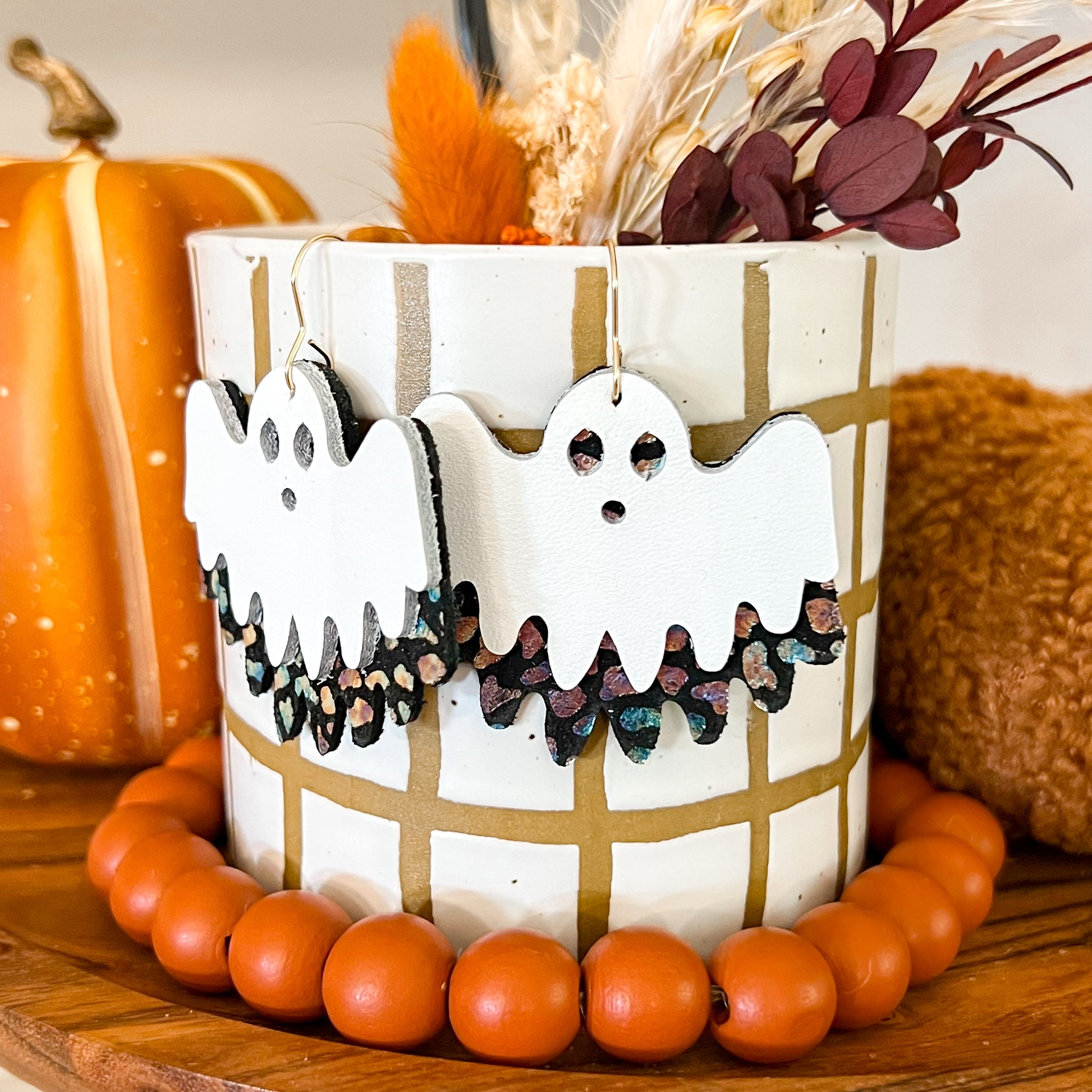 Meet your new Halloween favorite! These playful ghost earrings are handmade from genuine leather with a holographic leopard layer that shimmers with every move.