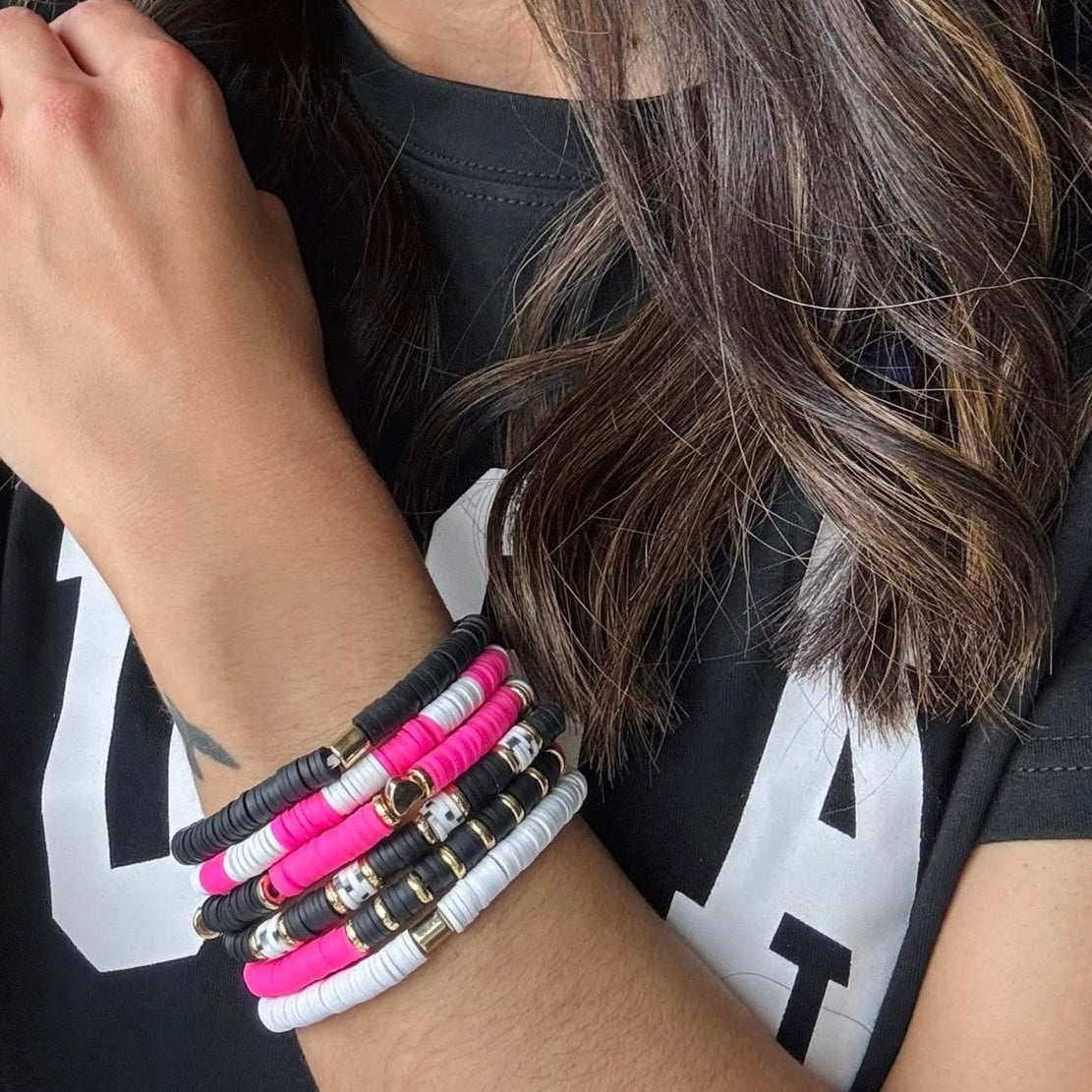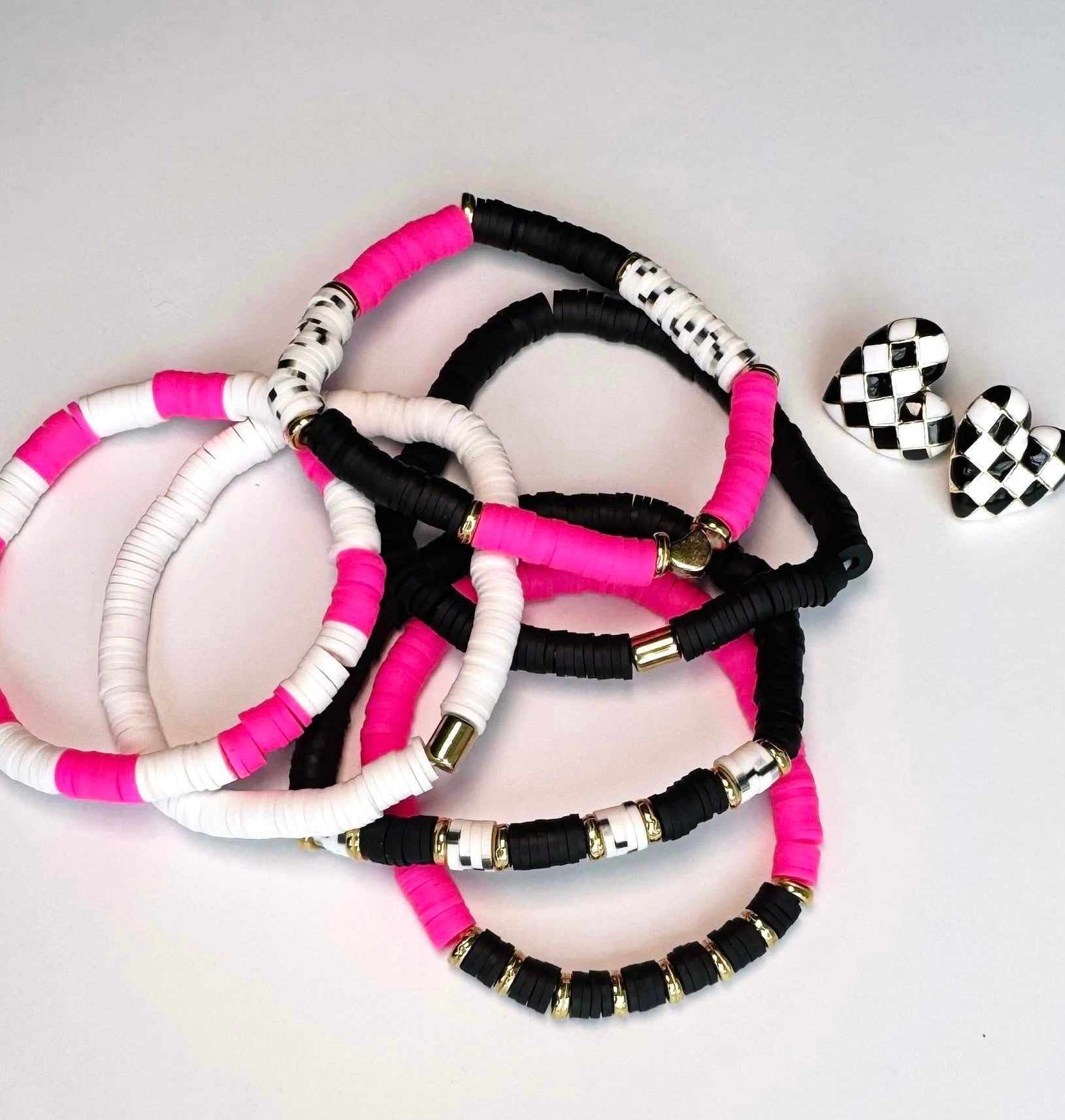 Featuring a vibrant mix of hot pink, crisp white, and classic black beads, these stretchy bracelets are perfect for adding personality to any outfit.