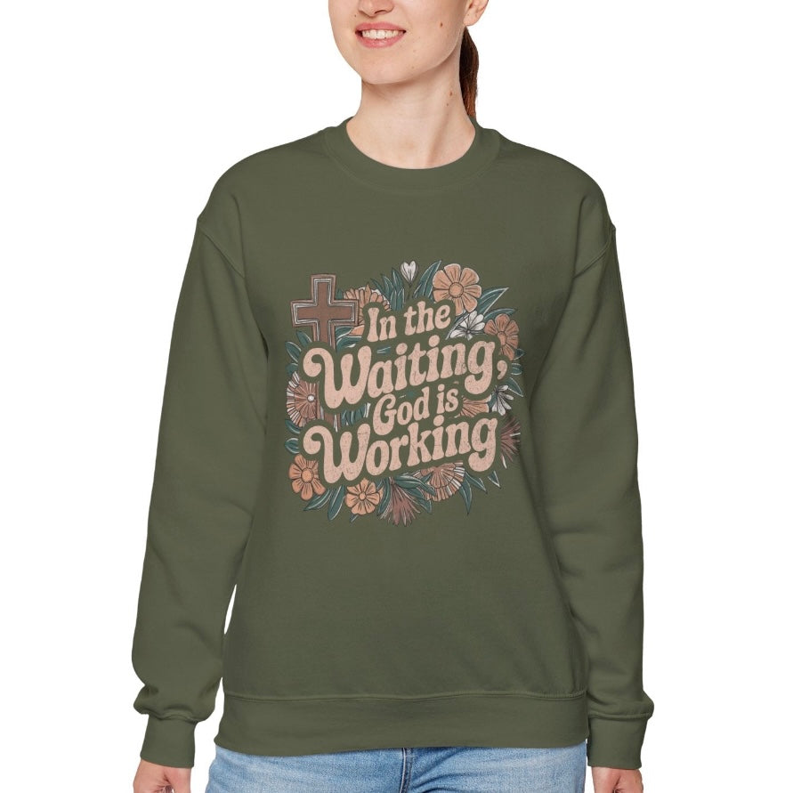 Embrace comfort and style with this cozy crewneck sweatshirt. Perfect for lazy days or casual outings, this sweatshirt features a lovely floral and cross design with the uplifting phrase, "In the Waiting God is Working".