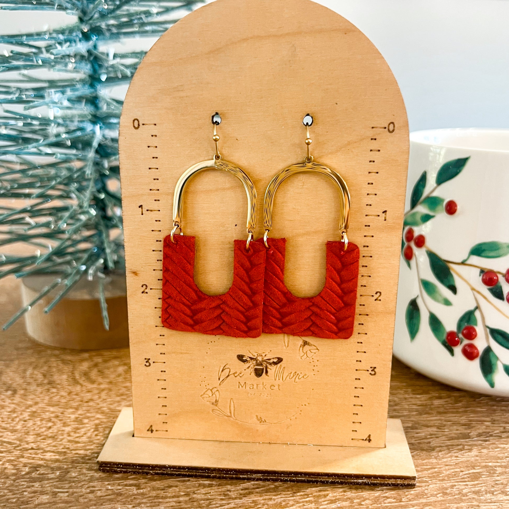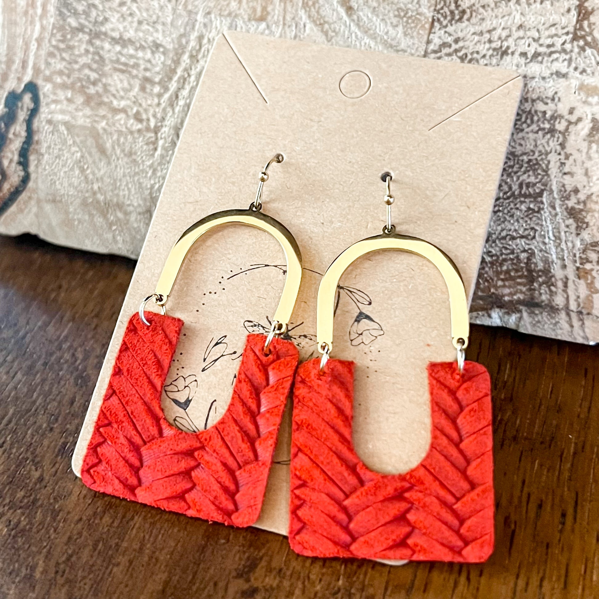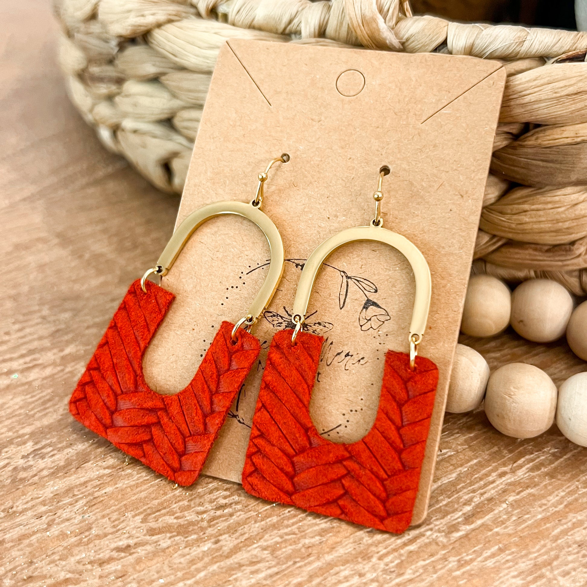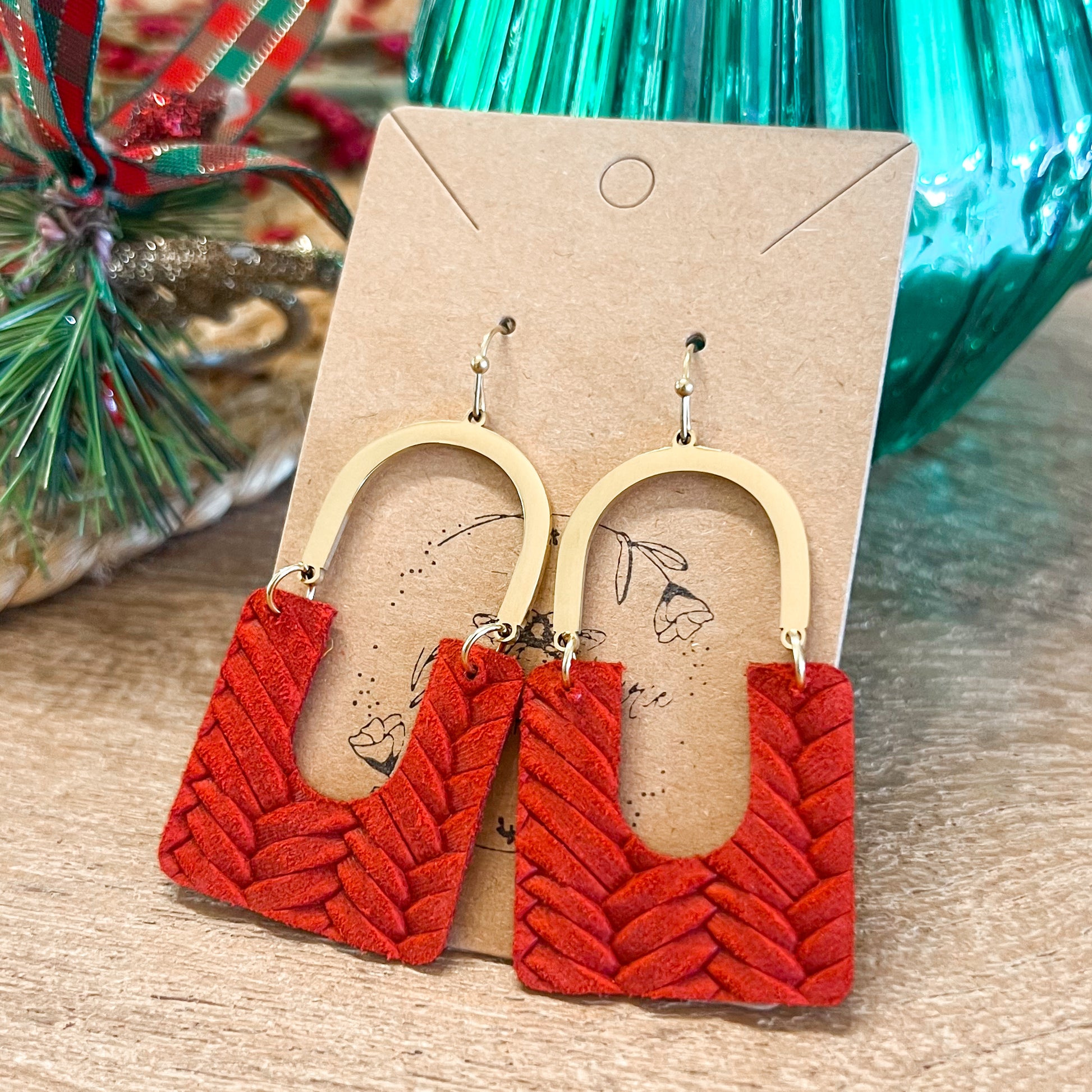Handmade genuine leather earrings with a festive braided texture and gold stainless steel hooks.