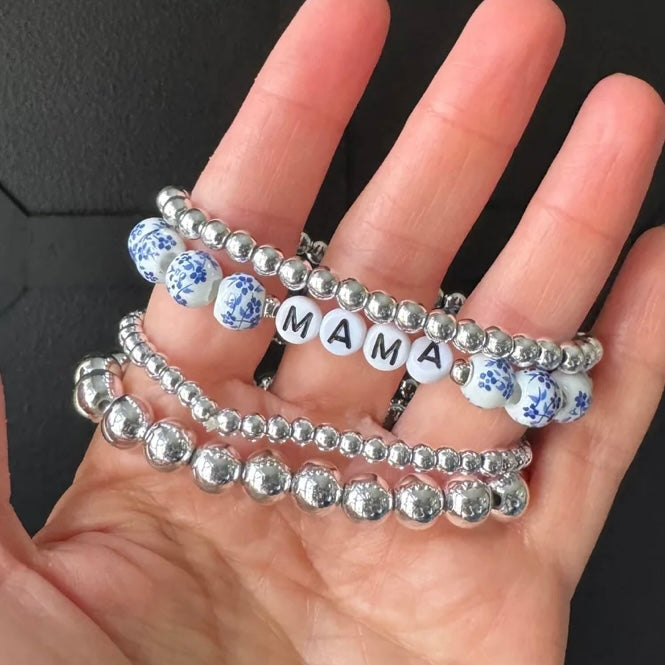 Mama Blue & White Silver Beaded Stacked Bracelet Set