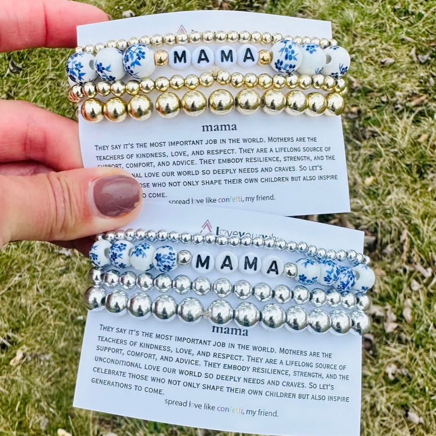 Each bracelet is designed to coordinate perfectly, with letter beads spelling out “MAMA” at the center. The combination of textures and tones gives this set a trendy, elevated look — perfect for everyday wear or dressing up.