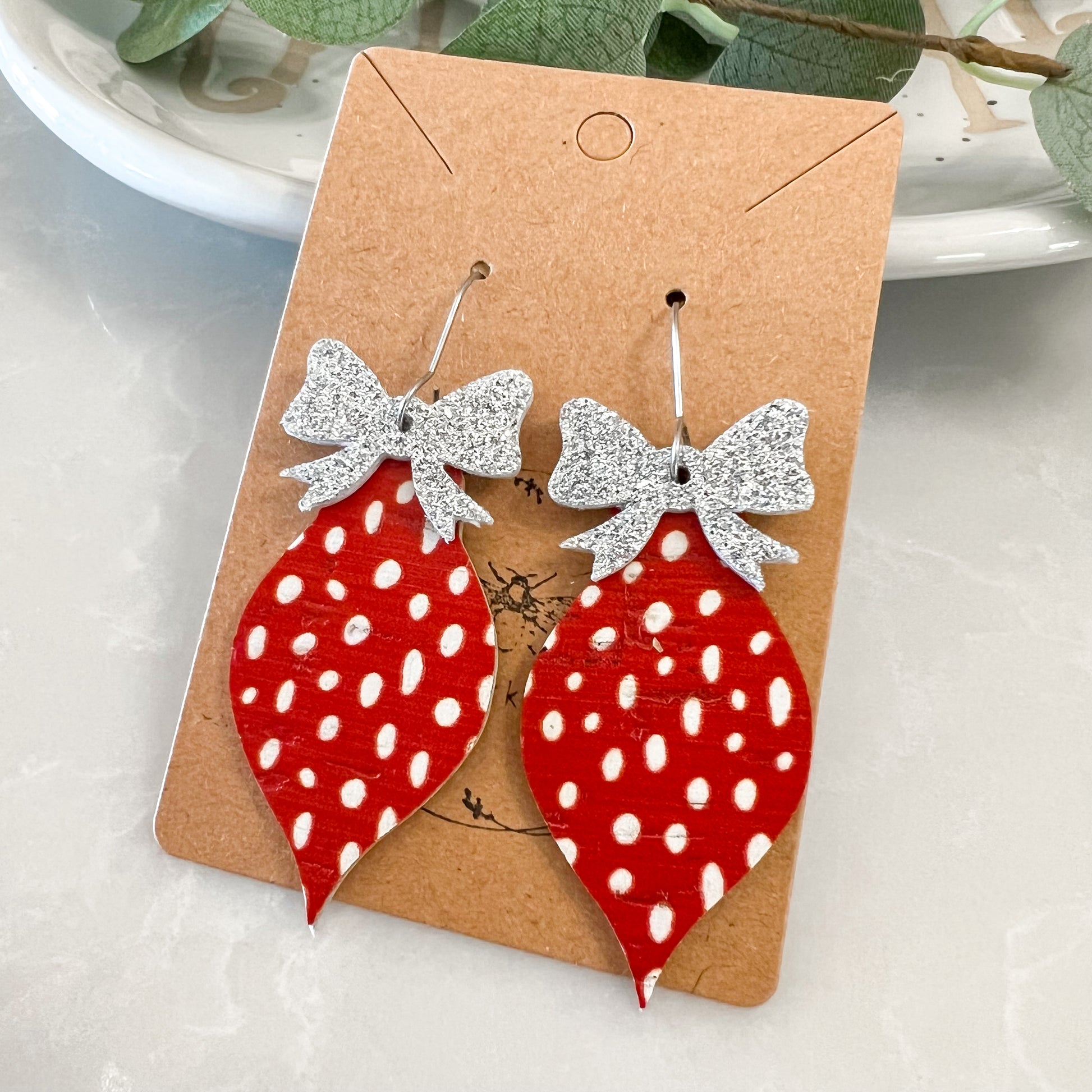 Handmade genuine leather earrings that sparkle with holiday cheer. Each pair features a bright red dotted ornament shape topped with a glittery silver bow.