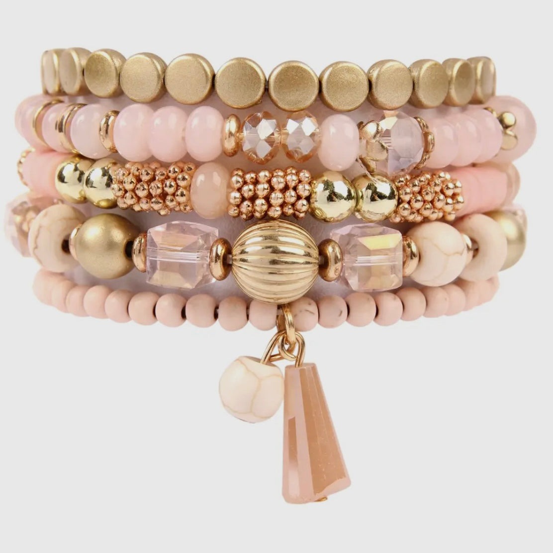 Add a soft, stylish touch to any outfit with these light pink stacked beaded bracelets.