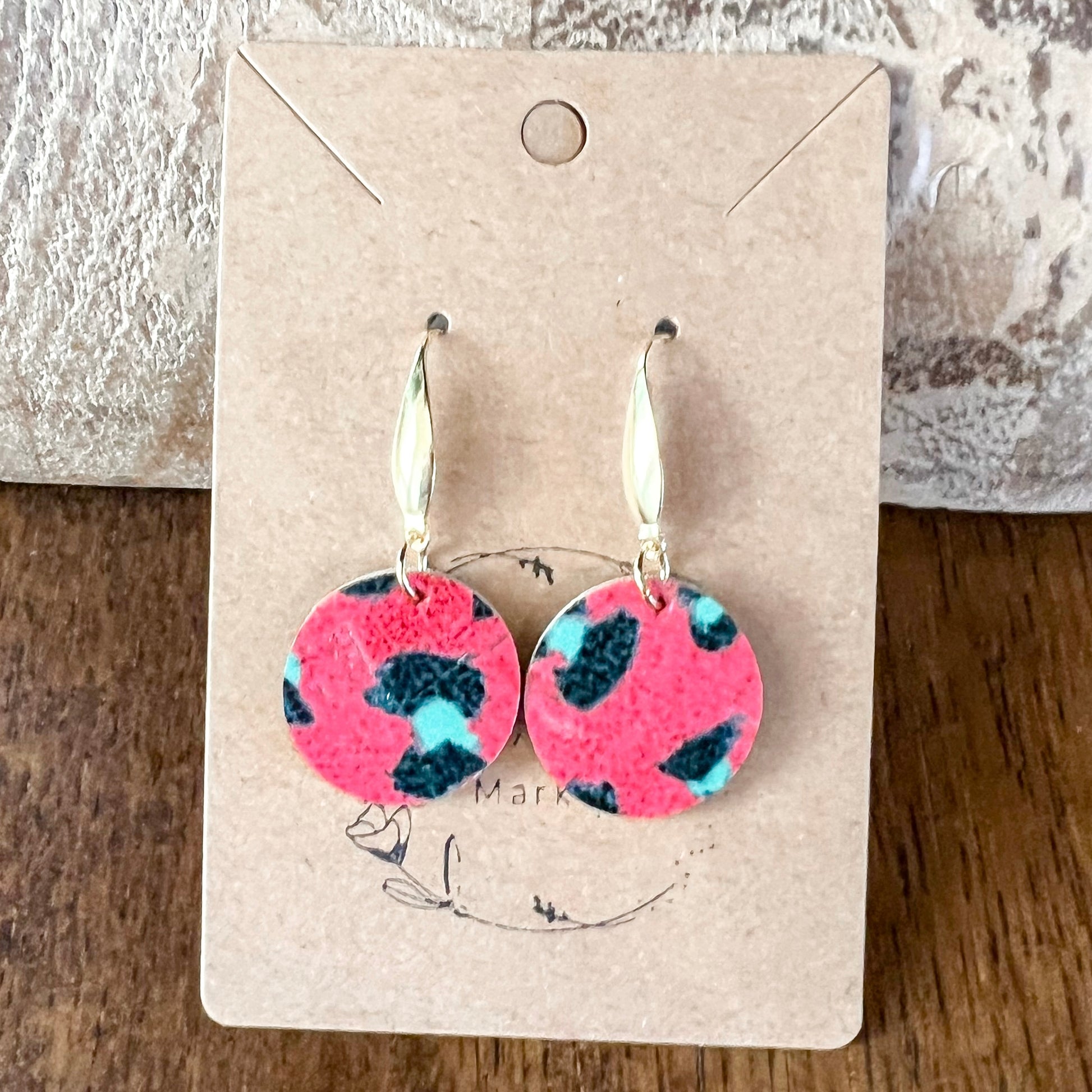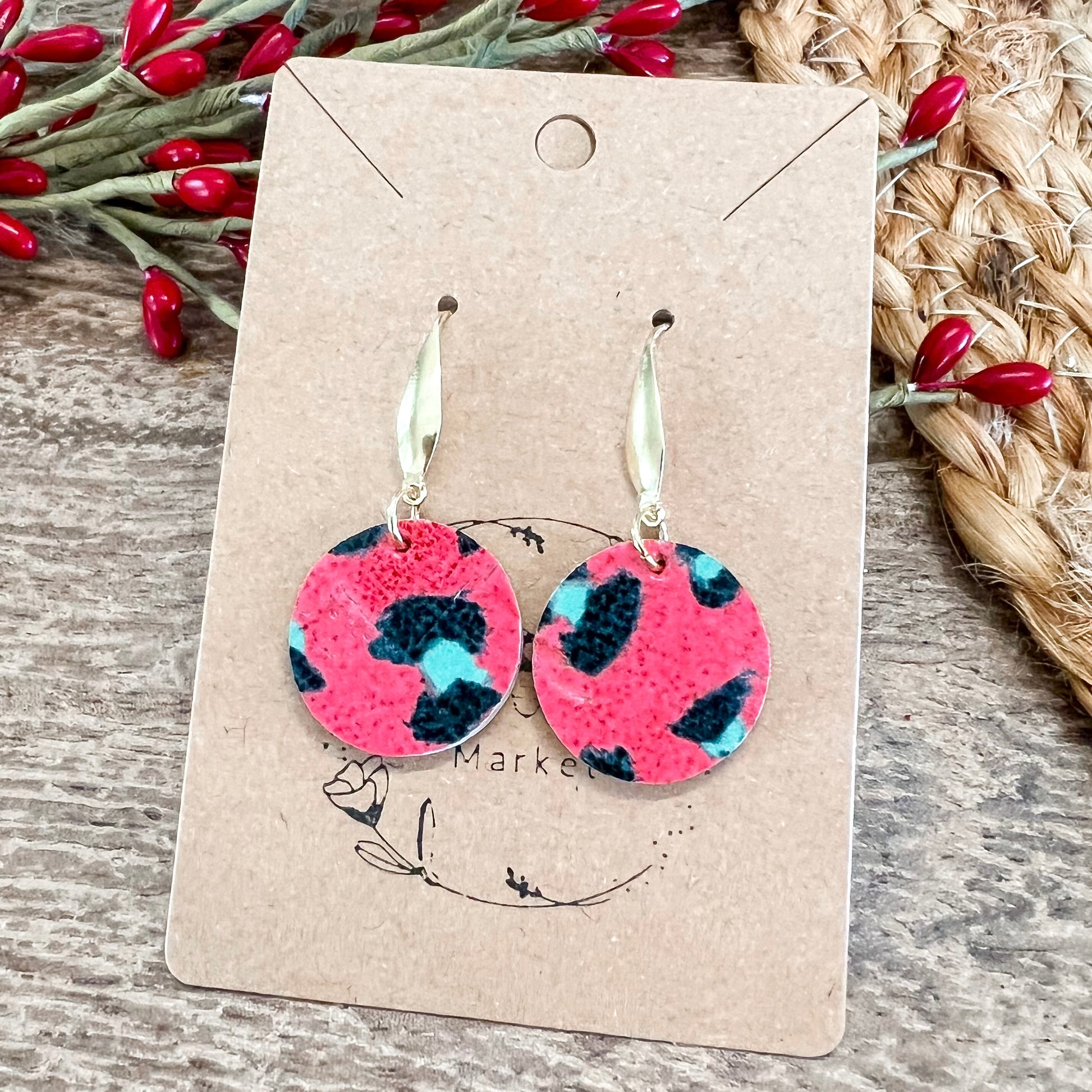 Handmade lightweight genuine leather earrings featuring a bold red and green leopard print. Stainless steel hypoallergenic hooks for all-day comfort.