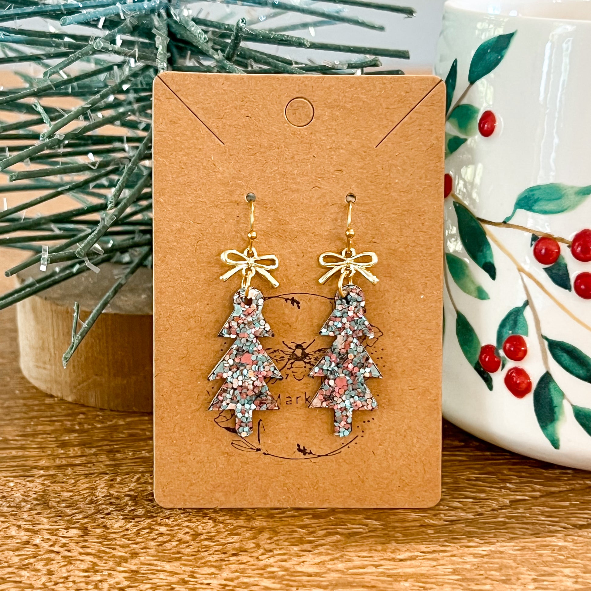 Handmade genuine leather earrings with skinny glitter trees topped by dainty bow. Lightweight, hypoallergenic, and the perfect festive sparkle for any holiday outfit.