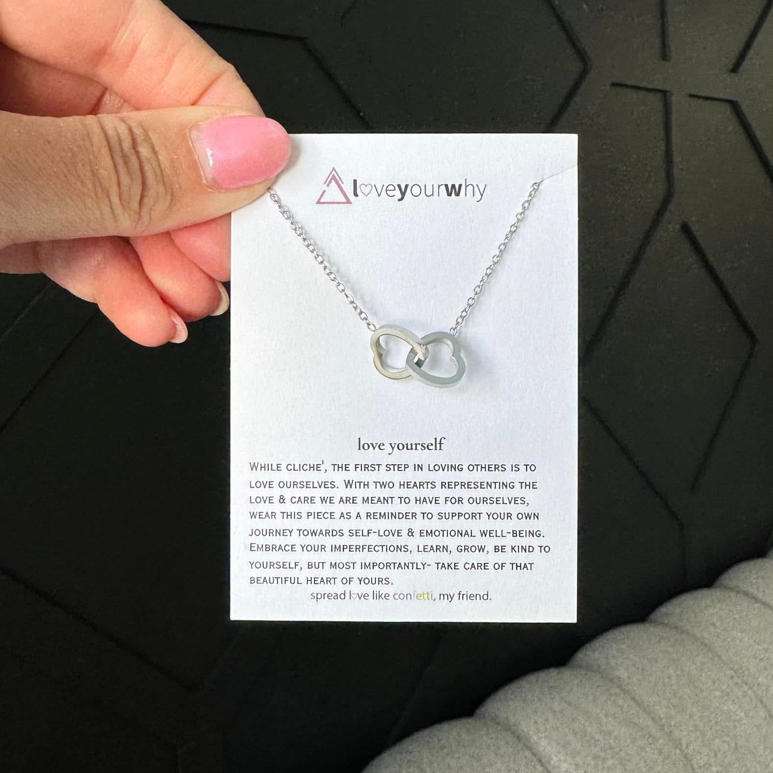 love yourself: while cliche', the first step in loving others is to love ourselves. With two hearts representing the love & care we are meant to have for ourselves, wear this piece as a reminder to support your own journey towards self-love & emotional well-being. Embrace your imperfections, learn, grow, be kind to yourself, but most importantly- take care of that beautiful heart of yours.