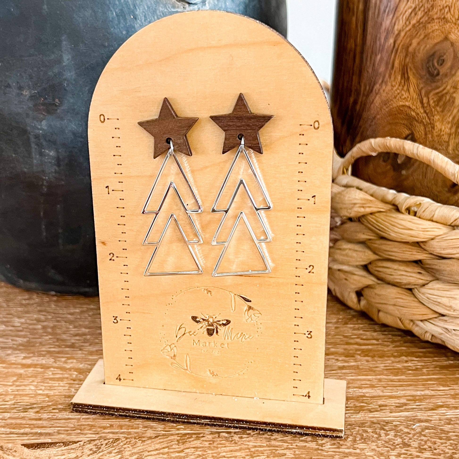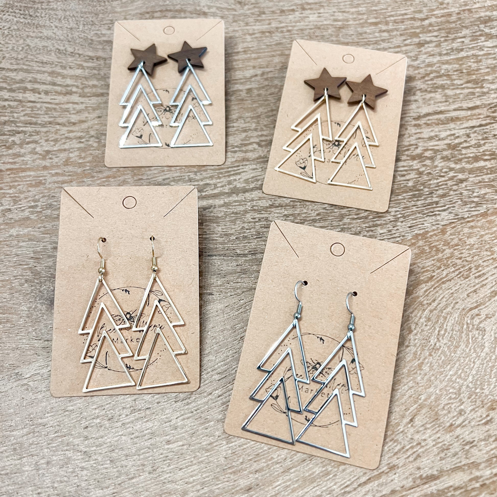 Lightweight, festive, and full of cozy holiday charm. These Christmas tree wire dangles hang from wooden star studs, giving a mix of rustic warmth and elegant sparkle.
