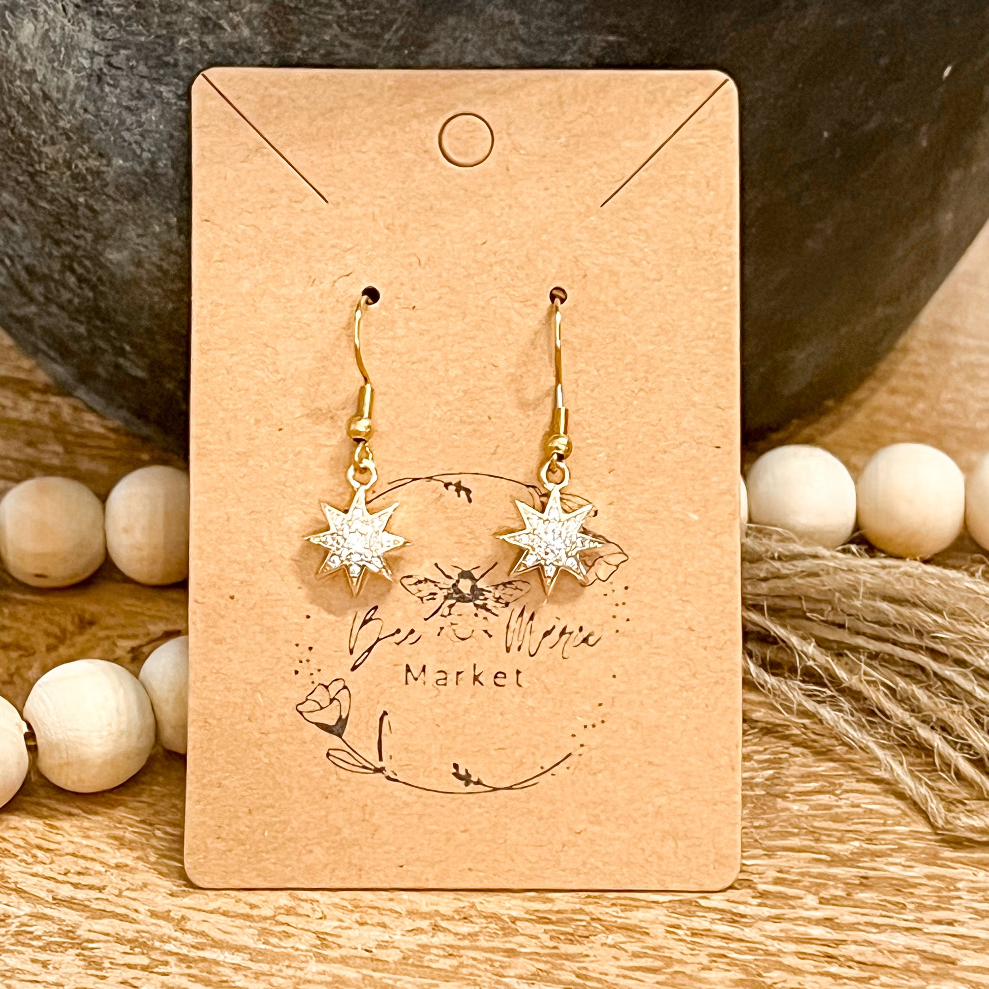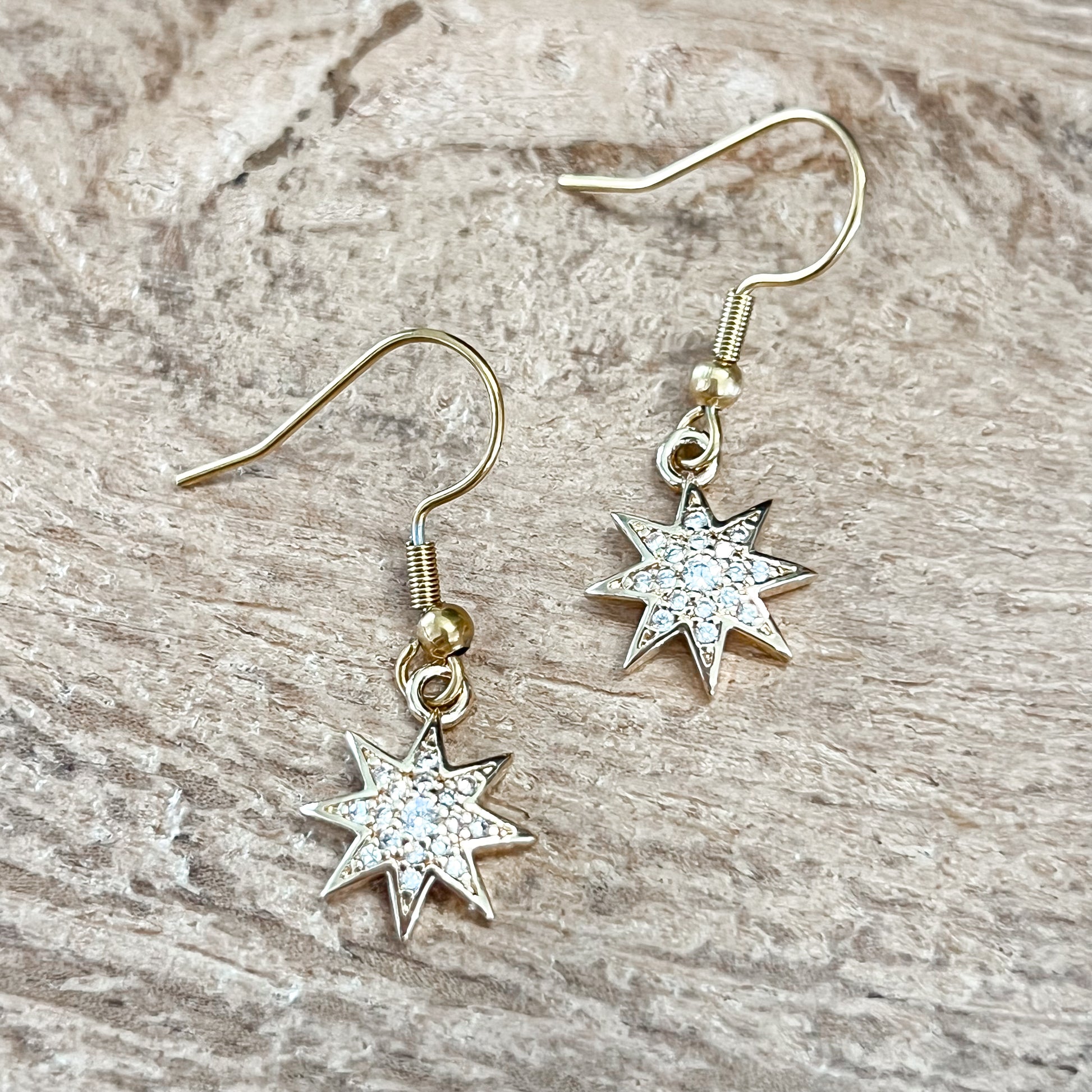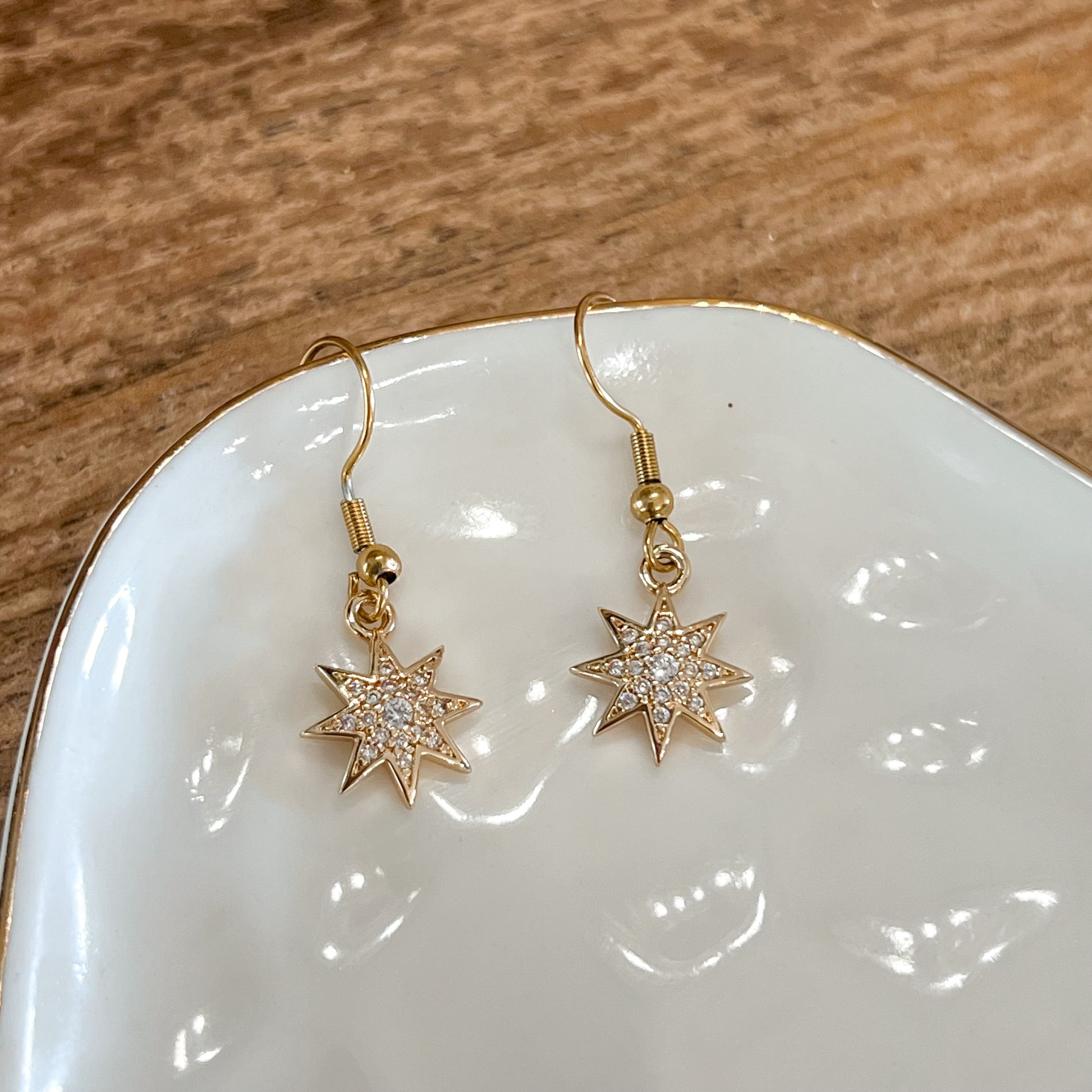 Tiny twinkle, big charm. These dainty gold star earrings shimmer with delicate rhinestones and hang from lightweight stainless steel hooks for all-day comfort.