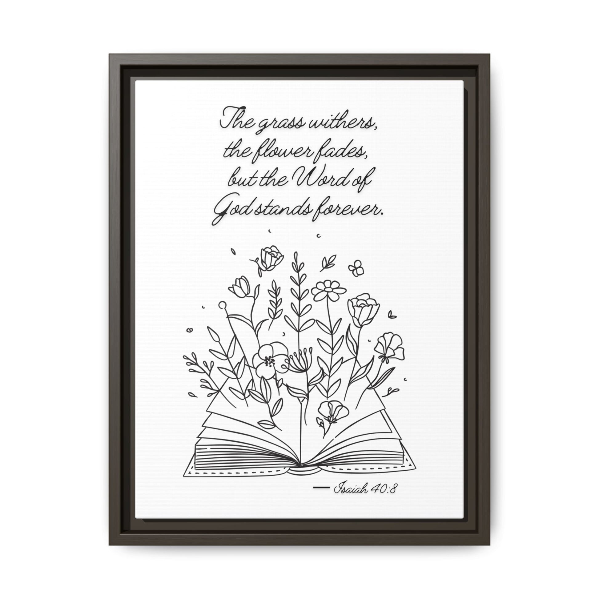 This beautifully framed black-and-white print brings Isaiah 40:8 to life with delicate florals rising from an open Bible — a powerful reminder that while seasons change, God’s truth never does.