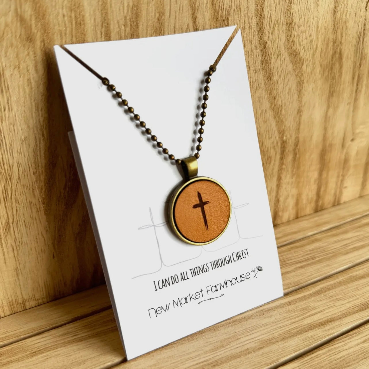 Each necklace is made from Veg Tan Leather and engraved with a cross.